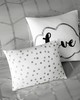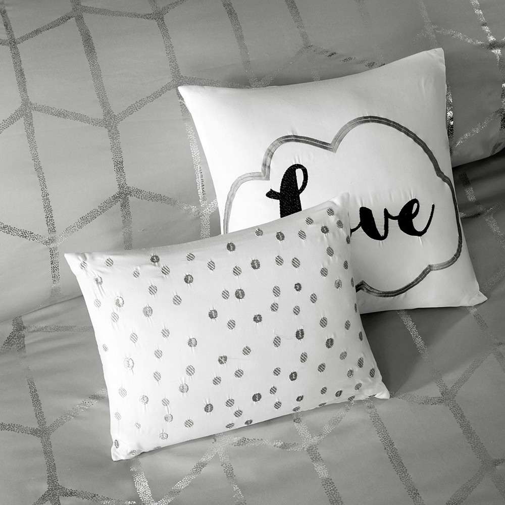 | Intelligent Design Full/Queen 1 Duvet Cover: 88"W x 90"L 2 Standard Shams: 20"W x 26"L + 1"D (2) 1 Decorative Pillow: 12"W x 16"L 1 Decorative Pillow: 16"W x 16"L Duvet Cover/Sham: 100% polyester 85gsm brushed microfiber, with silver metallic print on the face, solid 85gsm microfiber reverse Pillow: polyester cover and polyester filling. Button enclosure. With 4 corner ties inside. Modern/Contemporary Style Includes 5 Piece(s) Machine wash cold separately, gentle cycle. Do not bleach. Tumble dry low. Do not iron. If there is no free movement in washer/dryer, use large capacity commercial washer/dryer. Spot clean pillows. Freshen up your bedroom with the enchanting style of Intelligent Design’s Raina Printed Duvet Cover Set. The stunning duvet cover flaunts a geometric, metallic silver print against a soft grey ground for a fun and eye-catching look! Matching sham(s) echo the design seen on top of bed and pulls the entire ensemble together. Two embroidered decorative pillows with typography and metallic details complete this fabulous duvet cover set. This bedding set uses an antimicrobial treatment that provides built-in freshness protection, reducing the growth of odor causing bacteria to keep fabric lasting longer. Button closures allow you to place a comforter insert within the duvet cover and internal corner ties prevent it from shifting. |