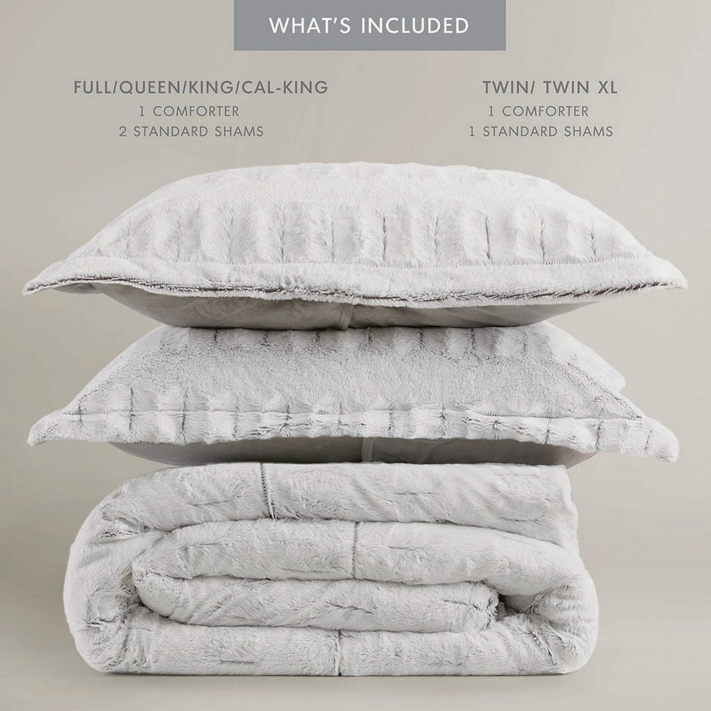 | Madison Park Twin/Twin XL 1 Comforter: 63"W x 90"L 1 Standard Sham: 20"W x 26"L+ 2"D Comforter: back print long fur to solid mink, 6D Poly Fiber Filling Sham: back print long fur to solid mink, 3" overlap on back open Glam/Luxury Style Includes 2 Piece(s) Machine Wash Sleep in the pure softness and comfort of the Madison Park Gia Back Print Long Fur Comforter Mini Set. The ultra-soft grey comforter flaunts a stylish brushed faux fur on the face that flips to a soft faux mink reverse, for a luxurious look and feel. Matching shams (1 sham for Twin sizes) mirror the design of the comforter and feature a 2-inch flange to complete the comforter set. Hypoallergenic filling in the faux fur comforter provides exceptional warmth and comfort, while the end-to-end box stitching keeps the filling in place. Incredibly soft, this reversible long fur comforter mini set brings the perfect amount of comfort and glamorous style to your bedroom decor. This comforter is OEKO-TEX certified, meaning it does not contain any harmful substances or chemicals to ensure quality comfort and wellness. |