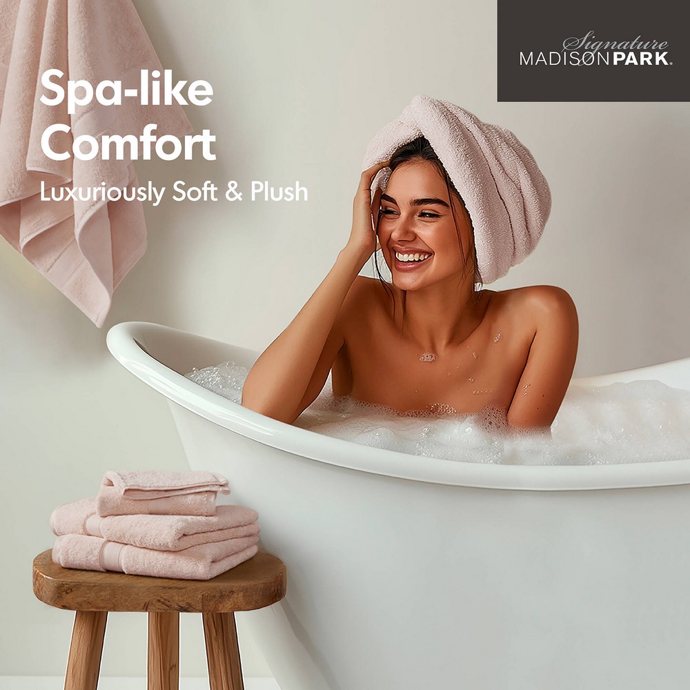 | Madison Park Signature 8-Piece 2 Bath Towels: 30"W x 54"L (2) 2 Hand Towels: 16"W x 28"L (2) 4 Wash Towels: 13"W x 13"L (4) 100% cotton Transitional Modern Style Includes 8 Piece(s) Wash before first use. Machine wash cold on gentle cycle with like colors. Only use non-chlorine bleach when needed. Avoid contact with products containing benzoyl peroxide. Do not wash with sharp items that may pull the towel fibers, such as zippers or hooks. To maintain the quality and performance of your towels, avoid the use of fabric softeners and dry sheets. Tumble dry low, remove promptly. Do not iron. Before use, simply shake towels to restore fluff and pile. Elevate your cleaning routine with our 800GSM 100% cotton towel set, boasting a highly absorbent, plush texture. Constructed with durable double-ply loops made from thick long-staple cotton using the zero twist technique, these premium towels minimize lint and provide lasting freshness thanks to their antimicrobial treatment for a seamless bathroom experience. Additionally, this set holds an Oeko-Tex Certification, demonstrating our dedication to safety and ensuring gentle, non-irritating skin contact. Available in a variety of colors, our towels offer a superior texture and bring a spa-like experience with you wherever you go. |