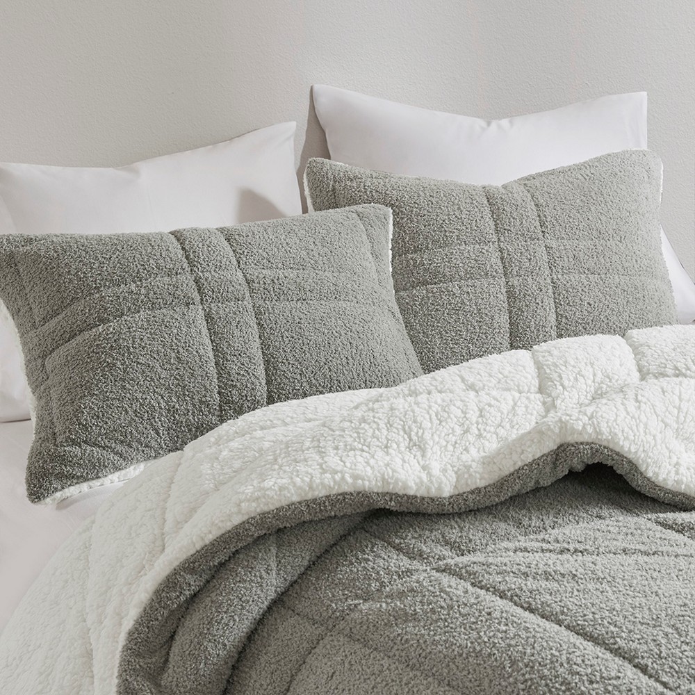 | Madison Park Full/Queen 1 Comforter: 90"W x 90"L 2 Standard Shams: 20"W x 26"L (2) Comforter/Sham: 100% polyester faux feathersoft, ivory sherpa reverse Fill: 100% polyester down alternative fiber Casual Style Includes 3 Piece(s) Machine Wash With a buttery soft face and a cozy sherpa reverse, this comforter set will make you want to stay in bed all day. The solid neutral grey tone and classic windowpane quilting make this bed match your decor easily. Its machine washable nature makes maintenance easy, and the OEKO-TEX certified material is safe on skin for durable, long lasting comfort. |