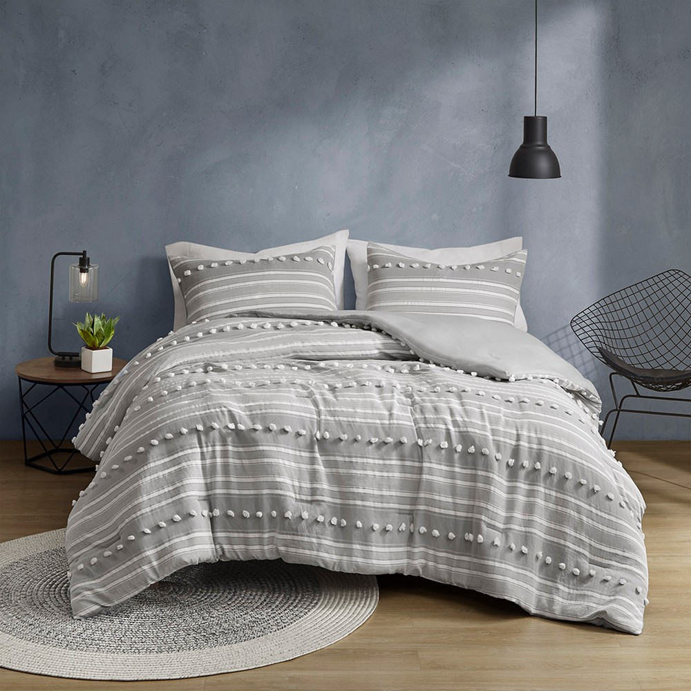| Urban Habitat Full/Queen 1 Comforter: 88"W x 92"L 2 Standard Shams: 20"W x 26"L (2) Comforter/Sham: 100% polyester jacquard face; microfiber back Fill: 100% polyester Modern/Contemporary Style Includes 3 Piece(s) Machine wash cold separately, gentle cycle. Do not bleach. Tumble dry low. Do not iron. If there is no free movement in washer/dryer, use large capacity commercial washer/dryer. The Urban Habitat Rowan comforter set features cationic dyed stripes and clip jacquard pompom details that bring a perfect blend of modern and casual style to your bedroom. The comforter has a soft microfiber reverse, while coordinating shams (1 in Twin/Twin XL) complete the look of the bedding set. The comforter is filled with hypoallergenic polyester filling that is treated to be dustproof, ensuring a restful and comfortable sleeping experience. Plus, this comforter set has an antimicrobial treatment to keep the bedding fresher for longer by inhibiting bacteria growth and is machine washable for easy care. |