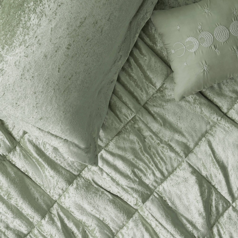 Create a luxuriously comfortable and lush bedroom space with the Intelligent Design Felicia Velvet Duvet Cover Set. The crushed velvet, green duvet cover features a quilted diamond top that adds dimension to the glamorous look. Matching shams (1 for Twin/Twin XL Sizes) coordinate with the velvet duvet cover, while an oblong decorative pillow provides the perfect finishing touch. Machine washable for easy care, this velvet duvet cover set brings incredible softness and comfort with a glamorous flair to your bedroom decor. Button closures allow you to place a comforter insert within the duvet cover and internal corner ties help prevent it from shifting (Insert is NOT included).