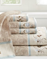 | Madison Park 6-Piece 2 Bath Towels: 27"W x 52"L (2) 2 Hand Towels: 16"W x 28"L (2) 2 Fingertip Towels: 12"W x 18"L (2) 550gsm cotton terry Traditional Style Includes 6 Piece(s) Wash before first use. Machine wash gentle cycle with like color in cold water. Only use non-chlorine bleach when needed. Do not wash with sharp items that may pull the towel fibers, such as zippers or hooks. To maintain the quality and performance of your towels, avoid the use of fabric softeners and dry sheets. Tumble dry low, remove promptly. Cool iron if necessary. Fold towels neatly and store in a dry ventilated place. Before use, simply shake towels to restore fluff and pile. Add a touch of elegance to your bathroom decor with our Madison Park Serene Embroidered Cotton Jacquard 6 Piece Towel Set. These cotton towels feature a jacquard leaf pattern with a floral embroidered hem, and blue contrast piping details to create a beautiful and sophisticated look. This cotton towel set is also OEKO-TEX certified (Made in Green), meaning it does not contain any harmful substances or chemicals, ensuring quality comfort and wellness. Highly absorbent and incredibly soft from its medium weight terry loop construction, this towel set is also machine washable for easy care for the perfect addition to any bathroom. Set includes: 2 standard 27x52" bath towels, 2 standard 16x28" hand towels, and 2 standard 12x18" fingertip towels. |
