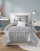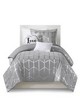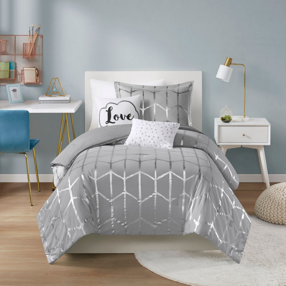 | Intelligent Design Twin/Twin XL 1 Comforter: 68"W x 90"L 1 Standard Sham: 20"W x 26"L + 1"D 1 Decorative Pillow: 12"W x 16"L 1 Decorative Pillow: 16"W x 16"L Comforter / Sham: Face:100% polyester brushed microfiber, with metallic printing Back: 100% polyester brushed micro fiber, solid Filling: 100% polyester 200gsm Pillow: polyester cover and polyester filling Modern/Contemporary Style Includes 4 Piece(s) Machine wash cold separately, gentle cycle. Do not bleach. Tumble dry low. Do not iron. If there is no free movement in washer/dryer, use large capacity commercial washer/dryer. Spot clean pillows. Freshen up your bedroom with the enchanting style of Intelligent Design’s Raina Comforter Set. The stunning comforter flaunts a geometric, metallic silver print against a soft grey ground for a fun and eye-catching look! Matching sham(s) echo the design seen on top of the bed to pull the entire ensemble together. Two embroidered decorative pillows with typography and metallic details complete this fabulous, ultra-soft microfiber comforter set. Set includes comforter, 2 shams (1 sham in Twin/TwinXL), 1 oblong and 1 square decorative pillows. This bedding set uses an antimicrobial treatment that provides built-in freshness protection, reducing the growth of odor causing bacteria to keep fabric lasting longer. Items in the set may come in a rolled or compressed packaging, which will need to be fluffed up or steam ironed before use to remove wrinkles. |