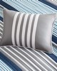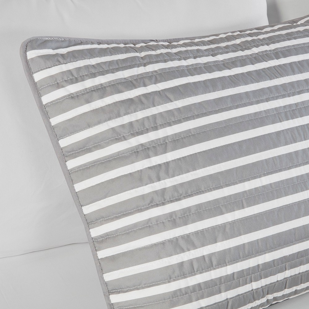 Give your bedroom a fresh new look with the Intelligent Design Paul Reversible Quilt Set. This quilted quilt features a modern striped print with wide and thin stripes in white, grey, navy, and teal with a solid grey reverse to create a handsome look. The 2 matching shams (1 in Twin/TwinXL) also showcase a simple stripe pattern that pairs perfectly with the comforter, while 2 decorative pillows add the finishing touches. Machine washable for easy care, this striped quilt set uses an antimicrobial treatment that provides built-in freshness protection, reducing the growth of odor causing bacteria to keep fabric lasting longer.