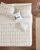 | Intelligent Design King/Cal King 1 Duvet Cover: 104"W x 90"L 2 King Shams: 20"W x 36"L + 1"D (2) 1 Decorative Pillow: 12"W x 16"L 1 Decorative Pillow: 16"W x 16"L Duvet Cover/Sham: 100% polyester brushed microfiber, with silver metallic print on the face, solid microfiber reverse, Pillow: polyester cover and polyester filling. Button enclosure. With 4 corner ties inside. Modern/Contemporary Style Includes 5 Piece(s) Machine wash cold separately, gentle cycle. Do not bleach. Tumble dry low. Do not iron. If there is no free movement in washer/dryer, use large capacity commercial washer/dryer. Spot clean pillows. Freshen up your bedroom with the enchanting style of Intelligent Design’s Raina Metallic Printed Duvet Cover Set. The stunning duvet cover flaunts a geometric, metallic gold print against a soft ivory ground for a fun and eye-catching look! Matching sham(s) echo the design seen on top of the bed to pull the entire ensemble together. Two embroidered decorative pillows with typography and metallic details complete this fabulous, ultra-soft microfiber duvet cover set. This bedding set uses an antimicrobial treatment that provides built-in freshness protection, reducing the growth of odor causing bacteria to keep fabric lasting longer. Button closures allow you to place a comforter insert within the duvet cover and internal corner ties prevent it from shifting. |