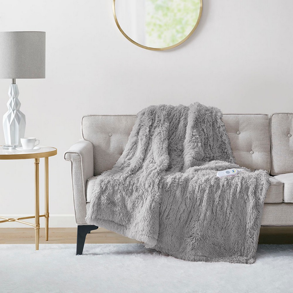 | Serta 50x60" 1 Heated Throw: 50"W x 60"L Face: solid shaggy fur, Back: solid microlight Glam/Luxury Style Includes 1 Piece(s) Machine Wash The Serta Malea Shaggy Faux Fur Heated Throw offers a rich textural touch to keep you warm and cozy. This heated throw flaunts an ultra-soft shaggy fur face that flips to a plush reverse to create an incredible soft look and feel. A single controller has 5 heat settings to easily find your preferred comfort level and the 3 hour auto shut off timer ensures your safety. Machine washable for easy care, this shaggy faux fur heated throw is great for bundling up in on those cold nights. |