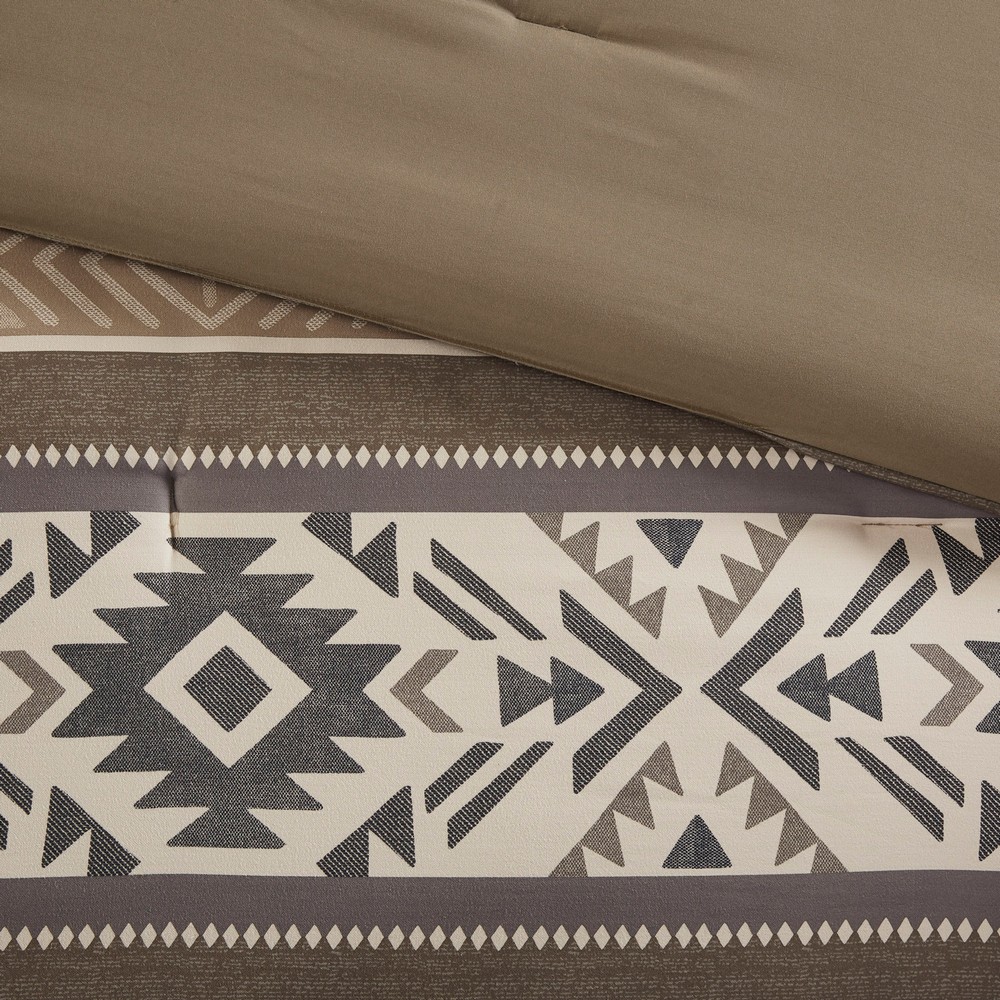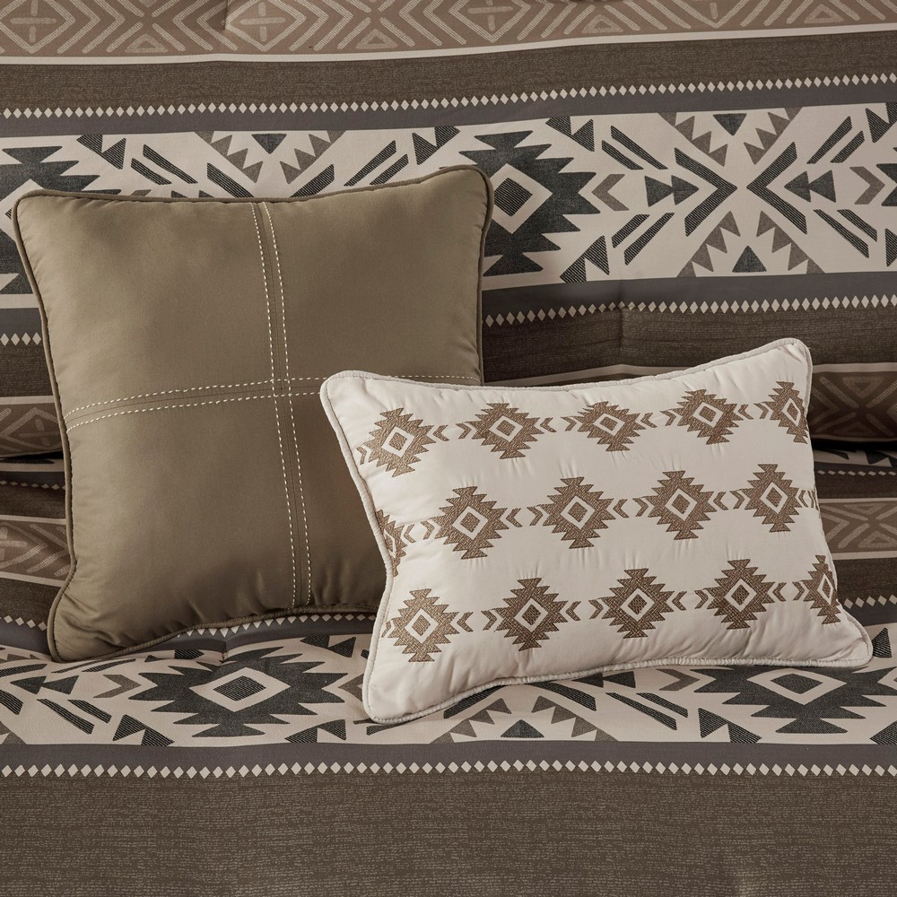 | Madison Park Full/Queen 1 Comforter: 90"W x 90"L 2 Standard Shams: 20"W x 26"L (2) 1 Square Throw Pillow: 18"W x 18"L 1 Oblong Throw Pillow: 12"W x 18"L Comforter and Sham: 100% polyester herringbone print, microfiber solid back Fill: 100% polyester Throw Pillows: Polyester Rustic/Lodge/Cabin Style Includes 5 Piece(s) Machine washable, spot clean pillows Spice up the bedroom with this southwestern-insprired comforter set featuring stipes with bold geometric patterns in hues of brown, tan, grey, and black. The design is printed on soft herringbone polyester enhancing the lodge aesthetics. The two throw pillows are embellished with embroidery, piecing and top stitching techniques. The comforter and pillows are filled with hypoallergenic polyester filling that is dustproof, ensuring a restful and comfortable sleeping experience. |