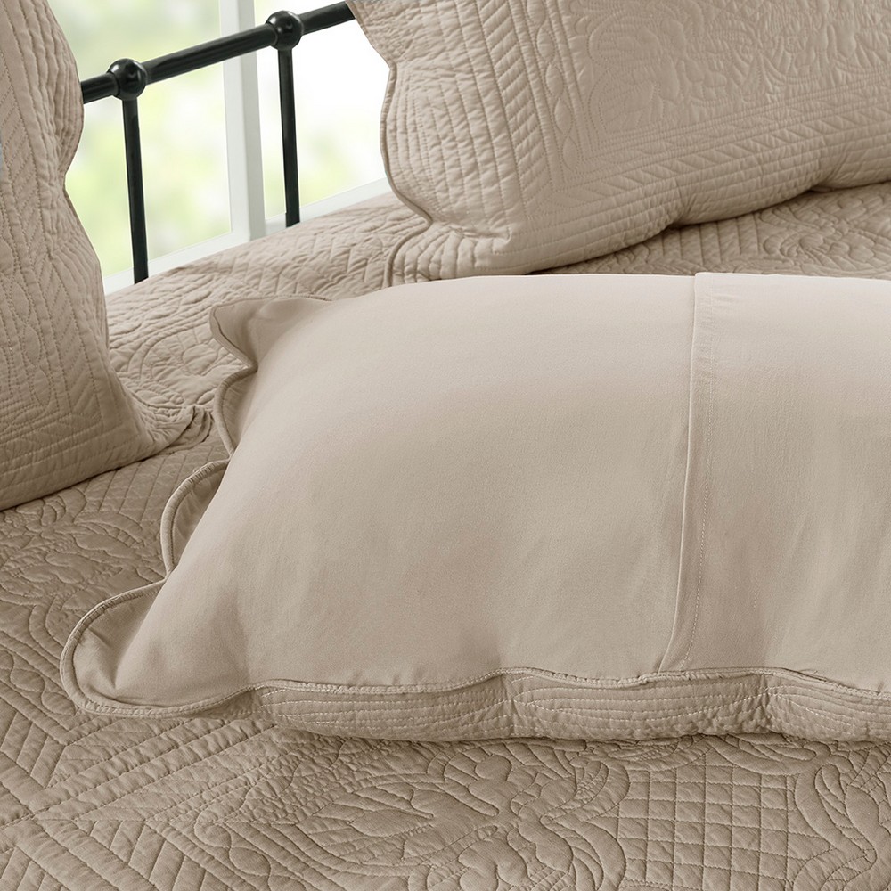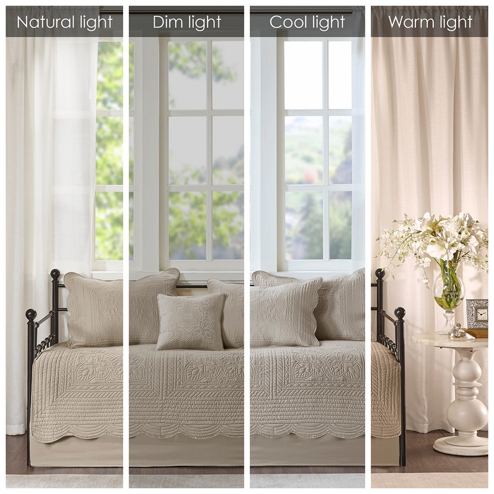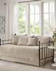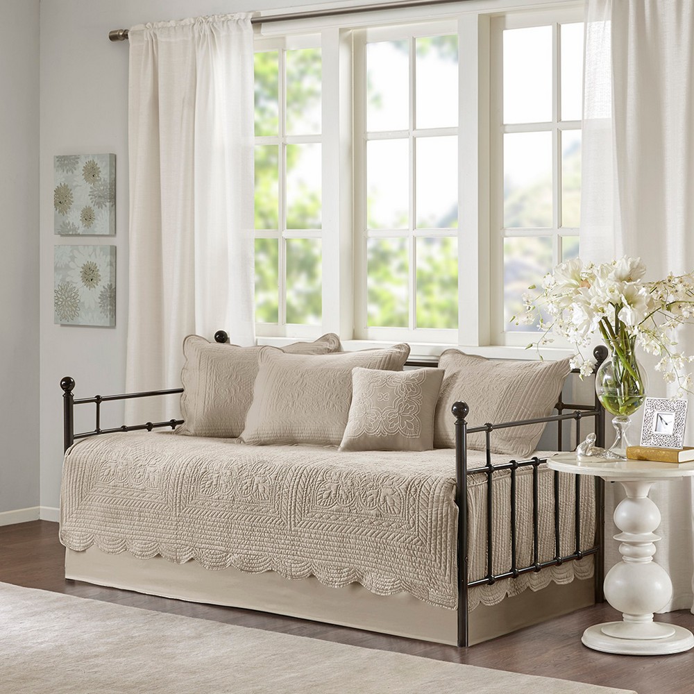 | Madison Park Daybed 1 Daybed Cover: 39"W x 75"L + 17"D 3 Standard Shams: 20"W x 26"L (3) 1 Bedskirt: 39"W x 75"L + 15"D 1 Decorative Pillow: 16"W x 16"L Daybed/shams: Soft brushed microfiber face and back Fill: 90% cotton, 10% other fibers fill, prewash finish Bedskirt/Pillow: Microfiber Farmhouse Style Includes 6 Piece(s) Machine washable, spot clean pillow The Madison Park 6 Piece Scalloped Edge Daybed Cover Set offers a charming cottage-inspired update to your guest bedroom. The daybed cover and 3 shams flaunt a classic stitch pattern with scalloped edges that add an elegant touch to your bedroom. A square decorative pillow with elegant embroidery and solid bed skirt add the finishing touches to the daybed set. This country daybed cover also has an antimicrobial treatment that provides built-in freshness protection, reducing the growth of odor causing bacteria to keep fabric lasting longer. The daybed cover easily fits a Twin size mattress. Items in the set may come in a rolled or compressed packaging, which will need to be fluffed up or steam ironed before use to remove wrinkles. |