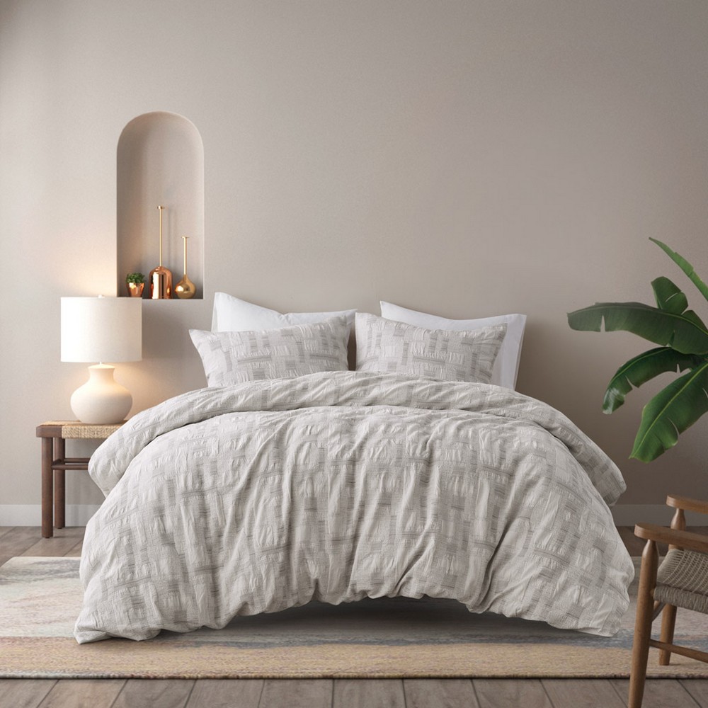 Introducing the new artisanal pattern from INK+IVY, designed to bring a unique touch of craftsmanship to your bedroom. This collection includes 100% cotton duvet cover and 2 matching shams, each with an easy overlap closure. This duvet cover features a beautifully designed jacquard weave with a geometric pattern that adds visual interest and texture. The duvet cover includes four inner ties to keep your insert secure (insert not included) and features a button closure. As an OEKO-TEX certified textile, you can rest assured knowing this product is safe to be in contact with your skin. The entire set is machine washable for easy care (please see the care label for detailed instructions), and we recommend using a commercial washer and dryer to provide ample room for movement and ensure optimal cleaning results.