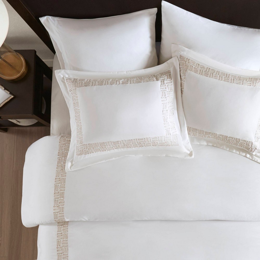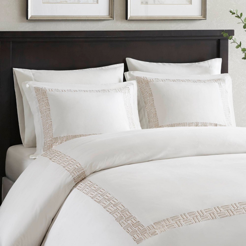 | Harbor House Full/Queen 1 Duvet: 90"W x 92"L 2 Standard Shams: 20"W x 26"L (2) Duvet/sham face: 300TC 100% cotton solid with embroidery back: 144TC 100% cotton solid Style Includes 3 Piece(s) Machine washable Transform your bedroom into a sophisticated sanctuary with luxurious modern classic hotel bedding, featuring the cultural elegance of Greek fret border embroidery in gold on a crisp white background. Complete with matching shams with flanges, this set is crafted from breathable, 100% natural cotton for year-round comfort. The high-density 300TC cotton sateen weave enhances durability. Slip on the duvet cover for lightweight, breathable, all-season cotton comfort. It is also designed with inner ties and a button closure to keep your insert securely in place. Oeko-Tex certified for high quality and overall wellness, this bedding is machine washable for easy care. |