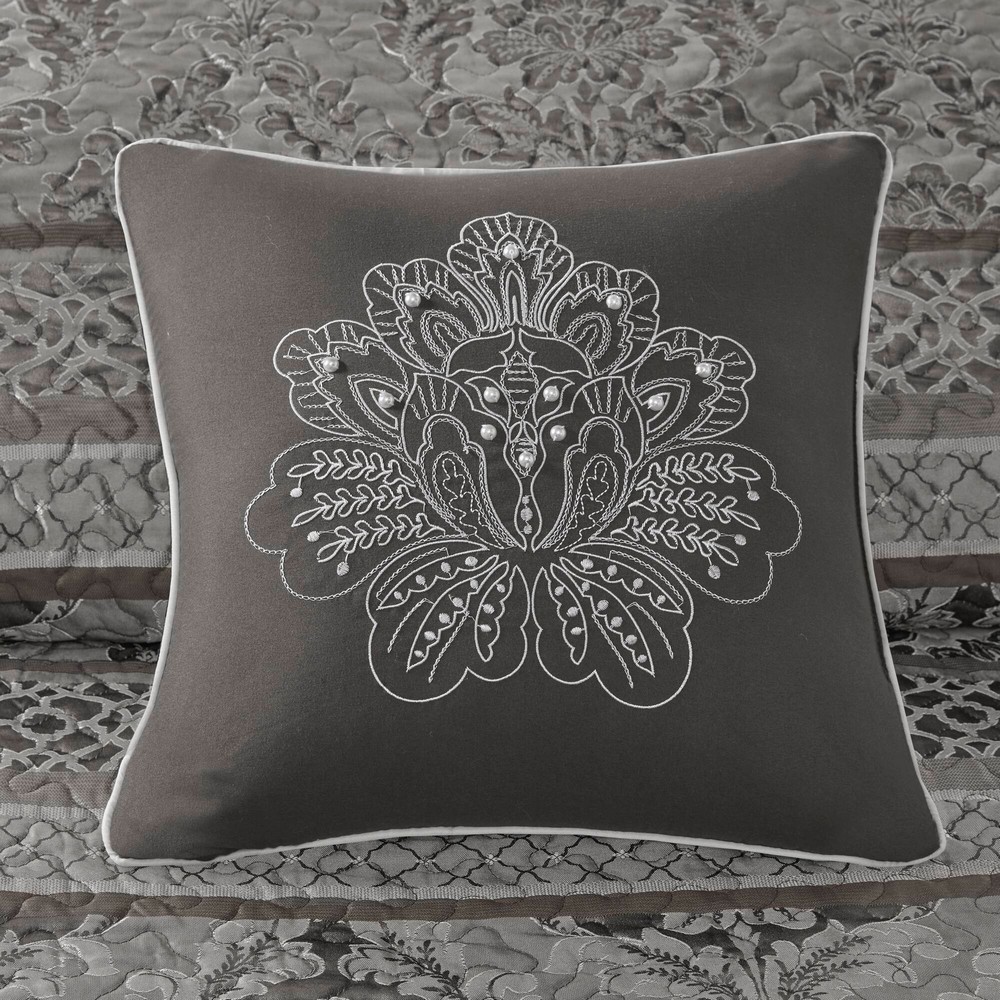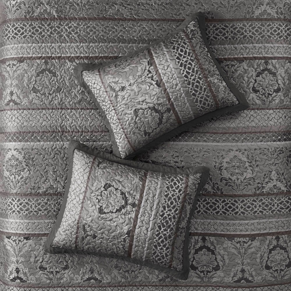 The Madison Park Bellagio 5 Piece Reversible Jacquard Bedspread Set offers a luxurious update to your bedroom decor. Made from quilted polyester jacquard, the brown/Gold bedspread and shams share leaf, woven striping, and ironwork motifs that are accentuated by elegant stitching. Flashes of gold are used throughout this collection adding a lavish feeling to your decor. Two decorative pillows feature embroidered details that correspond back to the coverlet to complete the stately ensemble. Machine washable for easy care, this jacquard bedspread brings an extravagant and traditional touch to your bedroom.