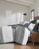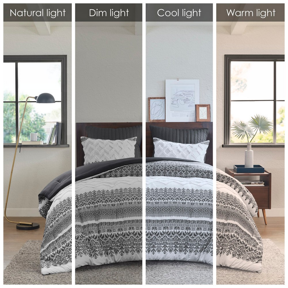 | Ink+ivy King/Cal King 1 Comforter: 104"W x 92"L 2 King Shams: 20"W x 36"L (2) Comforter/Sham: 100% Cotton, printed and tufted with chenille, solid cotton reverse, comforter filling: 100% polyester, front hidden bar tack. Sham with overlap closure at back. Boho Style Includes 3 Piece(s) Machine wash cold separately, gentle cycle. Tumble dry low. Do not bleach. Do not iron. Commercial washer and dryer recommended to provide ample room for movement Transform your bedroom with the charming shabby chic allure of the INK+IVY Mila 3 Piece Cotton Comforter Set with Chenille Tufting. The cotton comforter flaunts an updated gray botanic print, on a natural white ground, with tufted white chenille, in a chevron design, to create a charming farmhouse look. A solid gray reverse complements the top of the comforter, while hidden bartacking secures the hypoallergenic polyester filling without visible line for a clean finish. Two matching shams beautifully mimic the design of the comforter, completing the farmhouse comforter set. Machine washable, this cotton tufted comforter set offers soft comfort and a vivid touch that elevates your bedroom decor. |