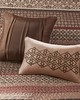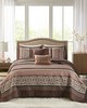 Add a touch of richness to your home décor with the Madison Park Princeton 5 Piece Reversible Jacquard Bedspread Set. Made from polyester jacquard, the bedspread and shams share leaf, striping, and medallion motifs that are accentuated by a solid chocolate brown border and reverse. Pops of red and ivory are also used throughout this bedding collection, adding a lavish feeling to your décor. Two decorative pillows feature pleating and embroidery details that coordinate with the top of the bed to bring the entire look together.