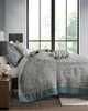 | Madison Park King 1 Bedspread: 120"W x 118"L 2 King Shams: 20"W x 36"L + 2"D (2) 1 Decorative Pillow: 18"W x 18"L 1 Decorative Pillow: 6.5"Dia. x 18"L Bedspread/Sham: 100% polyester jacquard face, microfiber solid back Fill: 90% cotton, 10% other fiber Pillow: 100% polyester faux silk shell, 100% polyester filling Traditional Style Includes 5 Piece(s) Machine washable, spot clean pillows The Madison Park Aubrey 5 Piece Reversible Jacquard Bedspread Set provides a classic update for your bedroom. The jacquard weave is inspired from an updated paisley motif and is woven into a beautiful combination of teal, grey, and a hint of silver for a touch of sheen to your bedding. The quilted bedspread and shams offer beautiful details with a teal flange and grey piping. The reverse is a matching grey color, while two decorative pillows feature pleating and embroidery details that coordinate with the top of the bed to bring the entire look together. |