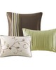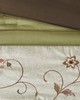 | Madison Park King 1 Comforter: 104"W x 92"L 2 King Shams: 20"W x 36"L (2) 1 Bedskirt: 78"W x 80"L + 15"D 1 Decorative Pillow: 12"W x 16"L 1 Decorative Pillow: 12"W x 18"L 1 Decorative Pillow: 18"W x 18"L Comforter/Sham: 100% polyester polyoni, pieced, solid polyester reverse, 8oz/yd2 polyester filling Bedskirt: 100% polyester polyoni, polyester platform Decorative Pillow:polyoni cover and polyester filling Traditional Style Includes 7 Piece(s) Machine wash cold, gentle cycle, and separately. Do not bleach. Tumble dry low, remove promptly. Do not iron. If there is no free movement in the washer or dryer, use large capacity commercial washer/dryer. The Serene Bedding Collection provides an elegant look to your home. The top of the comforter is a mix of green, chocolate brown, and taupe with piecing details while the taupe section has an embroidered floral pattern for a soft divide from these bold colors. Made from polyester dupioni, this fabric will produce a shine and pick up the light on both the comforter and shams. The decorative pillows come in a combination of solids, stripes, and embroidery to pull this whole set together. Items in the set may come in a rolled or compressed packaging, which will need to be fluffed up or steam ironed before use to remove wrinkles. |