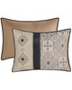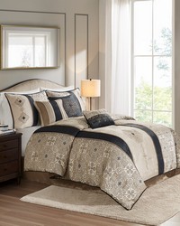 | Madison Park Cal King 1 Comforter: 104"W x 92"L 2 King Shams: 20"W x 36"L (2) 1 Bedskirt: 72"W x 84"L + 15"D 1 Decorative Pillow: 18"W x 18"L 1 Decorative Pillow: 12"W x 18"L 1 Decorative Pillow: 16"W x 16"L Comforter/Sham: 100% polyester jacquard pieced with solid polyoni with embroidery, 100% polyester brushed fabric reverse Filling: 100% polyester Bedskirt: 100% polyoni drop, polyester platform Pillow: 100% polyester shell, polyester filling Traditional Style Includes 7 Piece(s) Machine washable, spot clean pillows This traditional jacquard comforter features a modern color blocked aesthetic with embroidered medallion details against a lighter base color. The bold vertical stripes effortlessly draw your eyes into this beautiful comforter while the three decorative pillows further accentuate the colors and embroidered details found throughout the collection. Also include are two coordinating shams and a matching solid bed skirt which pull the whole look together. Colors found in this bed set include various shades of tan, taupe, brown while the stripe is offered in navy, red or black. This machine washable bedding set is filled with 100% polyester filling that is hypoallergenic and dustproof. |