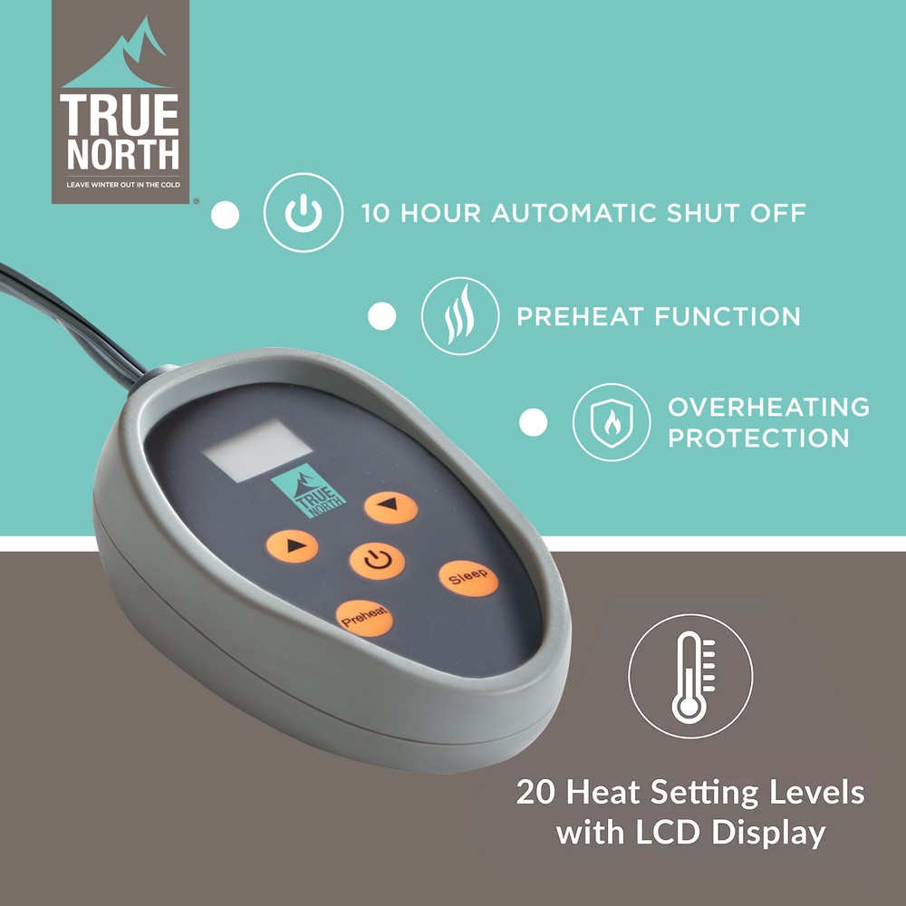 | True North By Sleep Philosophy King 1 Electric Blanket: 100"W x 90"L Face and Back: Solid sherpa, 100% polyester Casual Style Includes 1 Piece(s) Machine wash Designed with ultimate relaxation in mind, the True North by Sleep Philosophy electric heated blanket is the epitome of sophistication and comfort. This blanket features a sherpa face and reverse in a range of classic solid colors to suit any room style. The 20 heat settings allow the perfect warmth for any occasion, while overheating protection keeps safety top of mind to ensure you rest easy. Queen or King electric blanket has two controllers for desired temperature. Auto shut-off after 10 hours use if you don't shut if off before that time. Remove the electric plug and blanket is machine washable for hassle-free cleaning, and Oeko-Tex certified for quality comfort and wellness. Five years warranty so you can enjoy this product for many years to come. |