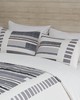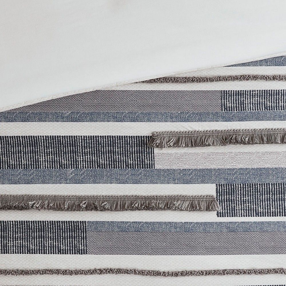 | Ink+ivy King/Cal King 1 Comforter: 104"W x 92"L 2 King Shams: 20"W x 36"L (2) Comforter/Sham face: 100% cotton percale, printed with fringe and textured chenille trims, hidden quilting Reverse: 100% cotton, solid Filling: 250gsm polyester fill Sham opening: 5" overlap opening on the back Mid-Century Modern Style Includes 3 Piece(s) Machine Wash The Serena 3 Piece Cotton Printed Comforter Set with trims offers a modern update to your bedroom. This soft, 100% cotton percale comforter features a navy and gray print with a subtle taupe accent print, for a chic artisan look. The comforter also flaunts gray fringe and chenille trims that add texture and dimension to the design, while a solid white reverse provides a neutral touch. Also included are 2 matching shams to complete this cotton bedding set. Machine washable for easy care, this cotton printed comforter set uses an antimicrobial treatment that provides built-in freshness protection, inhibits growth of odor causing bacteria, and keeps the fabric newer, longer. Items in the set may come in a rolled or compressed packaging, which will need to be fluffed up or steam ironed before use to remove wrinkles. |