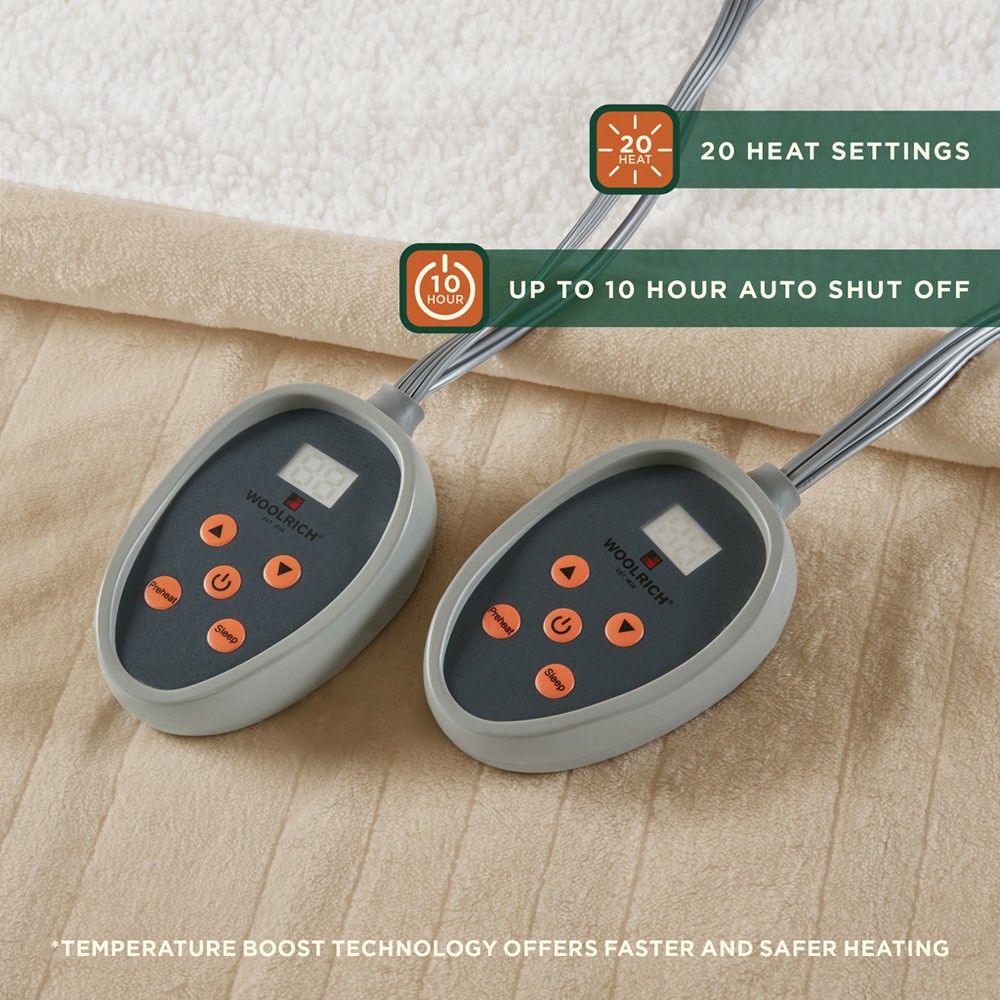 Sleep in ease in the Woolrich heated blanket with Secure Comfort Technology, which is designed to virtually eliminate ElectroMagnetic Field emissons. The soft flexible wires and ultra-soft microlight plush fabric ensures your comfort. It reverses to a soft berber that adds extra warmth and loft. The heated blanket features 10 hour auto shut off and has 20 different temperature settings so you can customize the precise temperature you want. Machine washable for easy care, this heated blanket is OEKO-TEX certified, meaning it does not contain any harmful substances or chemicals to ensure quality comfort and wellness. Twin and Full size have one controller, Queen and King size have 2 controllers. Includes manufacturer’s 5-year warranty.