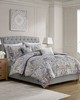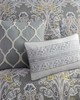 | Harbor House King 1 Duvet Cover: 106"W x 90"L 2 King Shams: 20"W x 36"L + 2"D (2) 1 Decorative Pillow: 18"W x 18"L 1 Decorative Pillow: 12"W x 20"L Duvet and sham Face: 100% cotton sateen T300 printed Back: T180 cotton solid Square & oblong pillow: 100% cotton with emb on top, hidden zipper closure, 100% poly fill Traditional Style Includes 1 Piece(s) Machine Washable, Spot Clean Pillows The Harbor House Hallie 5 Piece Cotton Duvet Cover Set introduces an elegant and traditional allure to your bedroom décor. Flaunting a beautiful damask pattern in grey hues with hints of blue and yellow, the oversized cotton duvet cover features a solid grey reverse to complement the top of the bed. Two cotton shams reiterate the damask print seen on the duvet cover, creating a beautiful coordinated look. To complete the bedding set are two decorative pillows with embroidered details provide the finishing touch. Made from soft cotton sateen, this duvet cover set will easily transform your bedroom into a stunning and lavish retreat. Button closures allow you to place a comforter insert (insert not included) within the duvet cover, while 4 internal corner ties prevent it from shifting. This bedding set is also OEKO-TEX certified, meaning it does not contain any harmful substances or chemicals, ensuring quality comfort and wellness. |