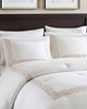 | Harbor House Cal King 1 Comforter: 110"W x 96"L 2 King Shams: 20"W x 36"L(2) 1 Bedskirt: 72"W x 84"L+15"D Comforter/sham face: 300TC 100% cotton sateen solid with embroidery back: 144TC 100% cotton solid Filling: 300 gsm polyester Bed skirt drop: 300 TC 100% cotton solid Style Includes 4 Piece(s) Machine washable Transform your bedroom into a sophisticated sanctuary with luxurious modern classic hotel bedding, featuring the cultural elegance of Greek fret border embroidery in gold on a crisp white background. Complete with matching shams with flanges and a bed skirt, this set is crafted from breathable, natural 100% cotton for year-round comfort. The high-density 300TC cotton sateen weave enhances durability, while the 300gsm overfilled poly fill delivers a fluffy, cozy feel with snug coverage. The oversized comforter provides enhanced coverage for greater comfort and practicality, and the dash stitching throughout the comforter prevents the fill from clumping, ensuring consistent warmth. Oeko-Tex certified for high quality and overall wellness, this set is machine washable for easy care. |