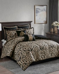 | Madison Park King 1 Comforter: 104"W x 92"L 2 King Shams: 20"W x 36"L(2) 1 Bed Skirt: 78"W x 80"L +15"D 1 Decorative Pillows: 18"W x 18"L 1 Decorative Pillow: 12"W x 18"L 2 Euro Shams: 26"Wx26"L(2) Comforter/Sham: 100% polyester jacquard with damask stria texture face, 100% polyester microfiber reverse Filling: 100% polyester, 8 OSY Euro Sham: 100% polyester charmeuse Bed Skirt: 100% polyester charmeuse, 100% polyester platform Dec Pillows: 100% pol Traditional Style Includes 8 Piece(s) Machine Washable Spot Clean Pillows Add a touch of class to your bedroom with the Madison Park 8 Piece Jacquard Comforter Set. The luxurious textured jacquard comforter and shams flaunt a gorgeous damask medallion design with striations on the satin ground that add dimension to the lavish look. A solid color reverse and stunning Euro shams complement the top of the bed to complete the ensemble. Also included are two decorative pillows that feature embroidery and cording details, while a solid color bed skirt provides a clean and elegant finish. Overfilled for superior warmth and comfort, this jacquard comforter set offers a strikingly luxurious update to your décor. Items in the set may come in a rolled or compressed packaging, which will need to be fluffed up or steam ironed before use to remove wrinkles. |