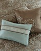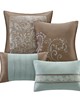 | Madison Park Essentials King 1 Comforter: 104"W x 92"L 2 King Shams: 20"W x 36"L (2) 1 Bedskirt: 78"W x 80"L + 15"D 1 Decorative Pillow: 16"W x 16"L 2 Decorative Pillows: 12"W x 18"L (2) 1 Decorative Pillow: 18"W x 18"L 2 Euro Shams: 26"W x 26"L + 2"D (2) 1 Flat Sheet: 108"W x Comforter/Sham: 100% polyester polyoni faux silk face, embroidered, 100% polyester microfiber reverse, 100% polyester filling Bedskirt: polyester polyoni faux silk drop, polyester platform Euro Shams: 100% polyester polyoni faux silk face, 100% polyeste Traditional Style Includes 24 Piece(s) MACHINE WASH COLD, GENTLE CYCLE, AND SEPARATELY. DO NOT BLEACH. TUMBLE DRY LOW, REMOVE PROMPTLY, DO NOT IRON. IF THERE IS NO FREE MOVEMENT IN THE WASHER OR DRYER, USE LARGE CAPACITY COMMERCIAL WASHER/DRYER. The Madison Park Essentials Brystol 24 Piece Room in a Bag provides a total makeover for your bedroom decor. This traditional comforter flaunts a soft blue and taupe jacquard paisley pattern with an accenting solid brown border to create a luxurious glam look. Matching pillow shams and solid soft blue Euro shams with 2-inch flanges coordinate beautifully with the elegant comforter. A solid brown bed skirt and 4 decorative pillows with embroidery and pleating details add the finishing touches to this paisley bedding set. Hypoallergenic polyester filling in the comforter and pillows contains no allergens and is treated to be dustproof. A 4 Piece sheet set is also included to complement the comforter and complete the jacquard bedding set. To elevate your bedroom, 4 solid brown window curtains with 2 paisley valances and 2 solid tiebacks are included to perfectly style your windows. Machine washable for easy care, this paisley comforter set may come in rolled or compressed packing and will need to be fluffed up. Use a steam iron to help remove wrinkles easier. Spot clean pillows. |
