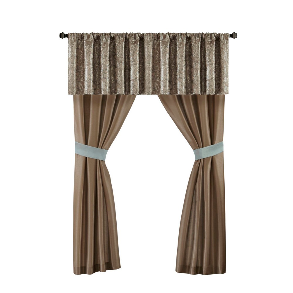 | Madison Park Essentials Cal King 1 Comforter: 104"W x 92"L 2 King Shams: 20"W x 36"L (2) 1 Bedskirt: 72"W x 84"L + 15"D 1 Decorative Pillow: 16"W x 16"L 2 Decorative Pillows: 12"W x 18"L (2) 1 Decorative Pillow: 18"W x 18"L 2 Euro Shams: 26"W x 26"L + 2"D (2) 1 Flat Sheet: 108"W Comforter/Sham: 100% polyester polyoni faux silk face, embroidered, 100% polyester microfiber reverse, 100% polyester filling Bedskirt: polyester polyoni faux silk drop, polyester platform Euro Shams: 100% polyester polyoni faux silk face, 100% polyeste Traditional Style Includes 24 Piece(s) MACHINE WASH COLD, GENTLE CYCLE, AND SEPARATELY. DO NOT BLEACH. TUMBLE DRY LOW, REMOVE PROMPTLY, DO NOT IRON. IF THERE IS NO FREE MOVEMENT IN THE WASHER OR DRYER, USE LARGE CAPACITY COMMERCIAL WASHER/DRYER. The Madison Park Essentials Brystol 24 Piece Room in a Bag provides a total makeover for your bedroom decor. This traditional comforter flaunts a soft blue and taupe jacquard paisley pattern with an accenting solid brown border to create a luxurious glam look. Matching pillow shams and solid soft blue Euro shams with 2-inch flanges coordinate beautifully with the elegant comforter. A solid brown bed skirt and 4 decorative pillows with embroidery and pleating details add the finishing touches to this paisley bedding set. Hypoallergenic polyester filling in the comforter and pillows contains no allergens and is treated to be dustproof. A 4 Piece sheet set is also included to complement the comforter and complete the jacquard bedding set. To elevate your bedroom, 4 solid brown window curtains with 2 paisley valances and 2 solid tiebacks are included to perfectly style your windows. Machine washable for easy care, this paisley comforter set may come in rolled or compressed packing and will need to be fluffed up. Use a steam iron to help remove wrinkles easier. Spot clean pillows. |