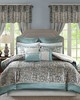 | Madison Park Essentials King 1 Comforter: 104"W x 92"L 2 King Shams: 20"W x 36"L (2) 1 Bedskirt: 78"W x 80"L + 15"D 1 Decorative Pillow: 16"W x 16"L 2 Decorative Pillows: 12"W x 18"L (2) 1 Decorative Pillow: 18"W x 18"L 2 Euro Shams: 26"W x 26"L + 2"D (2) 1 Flat Sheet: 108"W x 1 Comforter/Sham: 100% polyester polyoni faux silk face, embroidered, 100% polyester microfiber reverse, 100% polyester filling Bedskirt: polyester polyoni faux silk drop, polyester platform Euro Shams: 100% polyester polyoni faux silk face, 100% polyester Traditional Style Includes 24 Piece(s) machine washable, spot clean pillows The Madison Park Essentials Brystol 24 Piece Room in a Bag provides a total makeover for your bedroom decor. This traditional comforter flaunts a teal and grey jacquard paisley pattern with an accenting solid teal border to create a luxurious glam look. Matching pillow shams and solid teal Euro shams with 2-inch flanges coordinate beautifully with the elegant comforter. A solid grey bed skirt and 4 decorative pillows with embroidery and pleating details add the finishing touches to this paisley bedding set. Hypoallergenic polyester filling in the comforter and pillows contains no allergens and is treated to be dustproof. A 4 Piece sheet set is also included to complement the comforter and complete the jacquard bedding set. To elevate your bedroom, 4 solid teal window curtains with 2 paisley valances and 2 solid tiebacks are included to perfectly style your windows. Machine washable for easy care, this paisley comforter set may come in rolled or compressed packing and will need to be fluffed up. Use a steam iron to help remove wrinkles easier. Spot clean pillows. |