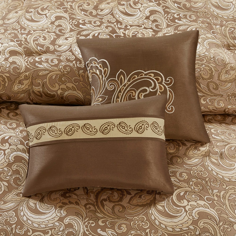 | Madison Park Essentials King 1 Comforter: 104"W x 92"L 2 King Shams: 20"W x 36"L (2) 1 Bedskirt: 78"W x 80"L + 15"D 1 Decorative Pillow: 16"W x 16"L 2 Decorative Pillows: 12"W x 18"L (2) 1 Decorative Pillow: 18"W x 18"L 2 Euro Shams: 26"W x 26"L + 2"D (2) 1 Flat Sheet: 108"W x 1 Comforter/Sham: 100% polyester polyoni faux silk face, embroidered, 100% polyester microfiber reverse, 100% polyester filling Bedskirt: polyester polyoni faux silk drop, polyester platform Euro Shams: 100% polyester polyoni faux silk face, 100% polyester Traditional Style Includes 24 Piece(s) machine washable, spot clean pillows The Madison Park Essentials Brystol 24 Piece Room in a Bag provides a total makeover for your bedroom decor. This traditional comforter flaunts a brown, taupe, and gold jacquard paisley pattern with an accenting solid brown border to create a luxurious glam look. Matching pillow shams and solid soft gold Euro shams with 2-inch flanges coordinate beautifully with the elegant comforter. A solid brown bed skirt and 4 decorative pillows with embroidery and pleating details add the finishing touches to this paisley bedding set. Hypoallergenic polyester filling in the comforter and pillows contains no allergens and is treated to be dustproof. A 4 Piece sheet set is also included to complement the comforter and complete the jacquard bedding set. To elevate your bedroom, 4 solid soft gold window curtains with 2 paisley valances and 2 solid tiebacks are included to perfectly style your windows. Machine washable for easy care, this paisley comforter set may come in rolled or compressed packing and will need to be fluffed up. Use a steam iron to help remove wrinkles easier. Spot clean pillows. |