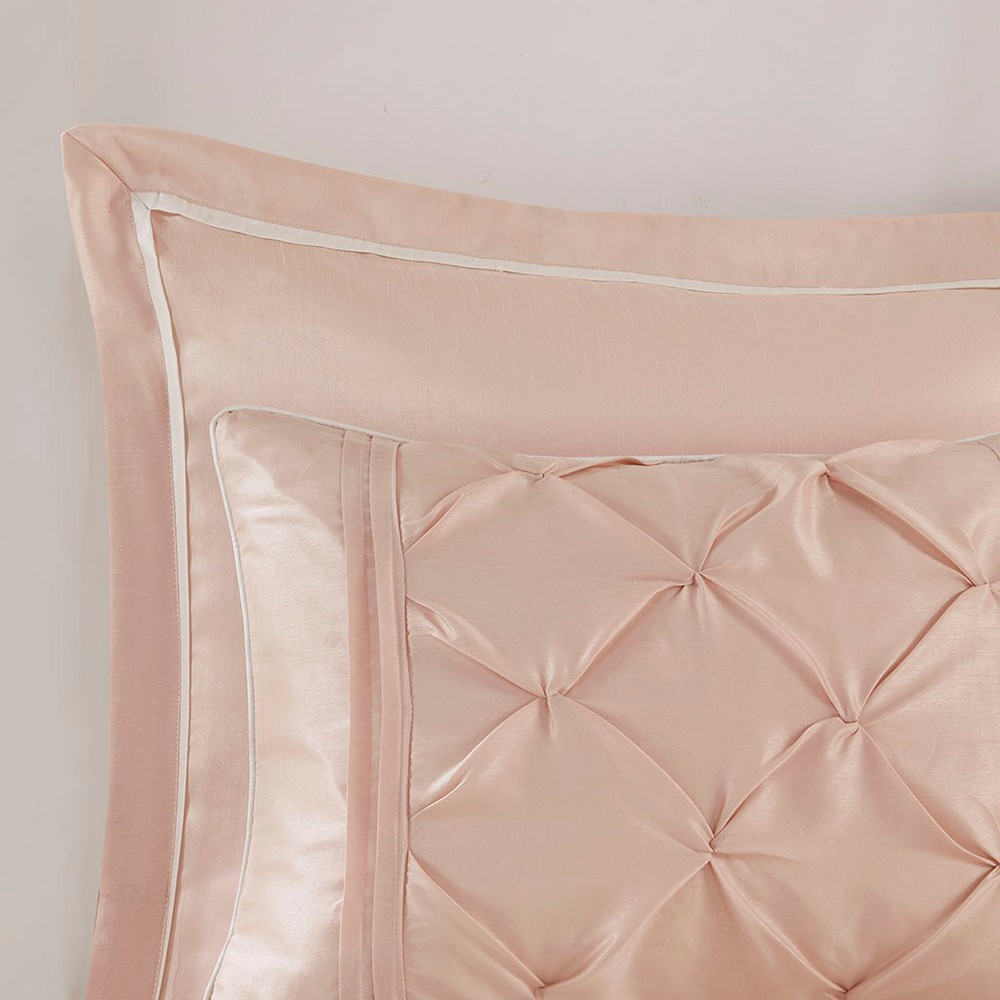 | Madison Park Essentials Cal King 1 Comforter: 104"W x 92"L 2 King Shams: 20"W x 36"L (2) 1 Bedskirt: 72"W x 84"L + 15"D 2 Euro Shams: 26"W x 26"L + 2"D (2) 1 Flat Sheet: 108"W x 102"L 2 King Pillowcases: 20"W x 40"L (2) 1 Fitted Sheet: 72"W x 84"L + 14"D 4 Window Panels: 42"W x Polyoni comforter and shams, 100% polyester filling; polyoni bedskirt, pillows and euro shams , soft brushed microfiber sheets , polyoni window set Transitional Modern Style Includes 24 Piece(s) Machine Washable Spot Clean Decorative pillows Invigorate your space with the Madison Park Essentials Joella 24 Piece Room in a Bag. The lavish tufted details flaunted on the comforter, shams, and window valances deliver an elegant statement in bold, natural hues. A large border frames the luxurious comforter, adding charm and dimension to the bedding set. Matching shams echo the motif seen on top of the bed, creating an elegant look in your space. An included microfiber sheet set and bed skirt complements the bedding collection and offers exceptional comfort and style. Two Euro shams and four embroidered decorative pillows help to complete the bedding set, giving it a finished look. Accompanying this bedroom set are four window panels with four tie backs to keep curtains drawn open, while two tufted valances provide the finishing touches to your bedroom. This bedding set may come in rolled or compressed packing and will need to be fluffed up. Use a steam iron to help remove wrinkles easier. |