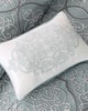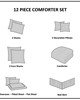 | Madison Park Cal King 1 Comforter: 106"W x 92"L 2 King Shams: 20"W x 36"L + 2"D (2) 1 Bed Skirt: 72"W x 84"L + 15"D 2 Euro Shams: 26"W x 26"L + 2"D (2) 1 Flat Sheet: 110"W x 102"L 1 Fitted Sheet: 72"W x 84"L + 14"D 2 Pillowcases: 20"W x 40"L (2) 1 Decorative Pillow: 1 Comforter/Shams: 100% polyester jacquard, 100% polyester brushed microfiber reverse, 8 osy polyester filling Bedskirt: 100% polyester polyoni fabric drop, polyester platform Euro Shams: 100% polyester Sheets and pillowcases: 100% cotton Pillows: 100% poly Traditional Style Includes 12 Piece(s) MACHINE WASH COLD, GENTLE CYCLE, AND SEPARATELY. DO NOT BLEACH. TUMBLE DRY LOW, REMOVE PROMPTLY, DO NOT IRON. IF THERE IS NO FREE MOVEMENT IN THE WASHER OR DRYER, USE LARGE CAPACITY COMMERCIAL WASHER/DRYER. The Madison Park Lavine 12 Piece Bedding Collection gives your bedroom a rich and luxurious makeover. The comforter features a greyish blue jacquard woven fabric with a 3D effect created by a damask design in light and dark grey. The two pillow shams match the comforter design to enhance the luxury style. Two decorative pillows with embroidery and fabric manipulation details coordinate with the two euro shams for a stunning bedroom look. The set also comes with a complete ivory 100% cotton sheet set that adds a cozy touch to the bedding set. The items in the set may arrive in a rolled or compressed form, so you may need to fluff them up or steam iron them to smooth out any wrinkles. |