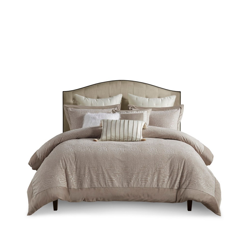Pescal Beige Oversized Velvet Comforter Set with Euro Shams and Throw Pillows King