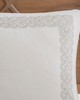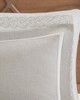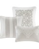 Madison Park Signature's Barely There 9 Piece Comforter Set provides a chic and charming update for the bedroom. Oversized and overfilled for maximum warmth and comfort, the textured comforter features a beautiful white chain stitch embroidery in an intricate damask pattern and natural palette of grey and beige. The solid natural reverse pairs well with the top of bed design, while shams in coordinating colors and simple trim complement the overall look. Three white Euro shams feature embroidered borders in a natural hue that add an elegant and sophisticated touch. A trio of decorative pillows, each with a distinct embroidered pattern or textural detail, round out the gorgeous bedding set. This comforter uses a removable duvet-style insert that is secured by inner ties and a hidden button closure. This provides no visible bartacking lines on top of the bed to create a smooth, clean face. Dry clean comforter cover only and machine wash comforter filler.