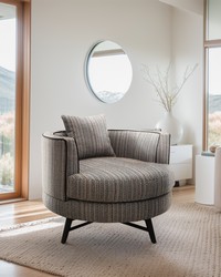 | Chapel Hill See below Overall: 35"W x 35.5"D x 27"H Seat Dimension: 24"W x 24"D x 19"H Arm Size: 24"W x 27"H Back Rest Size: 24"W x 8"H Solid Wood And Plywood Frame, Metal Swivel, High Resilience Foam(D28 For Back, H35 For Seat), 24% Rayon, 76% fabric Style Includes 1 Piece(s) Spot clean The Chapel Hill Harper Swivel Chair combines modern style with plush comfort, perfect for living rooms, bedrooms, or home offices. Upholstered in neutral fabric, this round lounge chair invites relaxation with its cozy, cushioned seat. The 360-degree swivel base allows you to follow the action or conversation with ease, while the sleek black legs create a striking contrast that complements any contemporary decor. Designed for durability, this lounge chair features an ergonomic, supportive frame and a comfortable round seat, making it ideal for lounging, reading, or unwinding. Its minimalist design effortlessly fits into various interiors, adding a stylish and functional accent. The Harper Swivel Chair requires no assembly, allowing for a quick and easy setup. Upgrade your space with this versatile, modern chair that brings both comfort and sophistication to any room. |