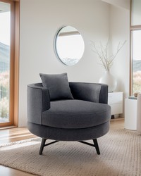 | Chapel Hill See below Overall: 35"W x 35.5"D x 27"H Seat Dimension: 24"W x 24"D x 19"H Arm Size: 24"W x 27"H Back Rest Size: 24"W x 8"H solid wood and Plywood frame, metal swivel, High resilience Foam(D28 for back, H35 for seat),24% Rayon,76% T fabric Style Includes 1 Piece(s) Spot clean The Chapel Hill Harper Swivel Chair offers a stylish blend of modern design and unmatched comfort, perfect as a living room chair or bedroom chair. Upholstered in durable, high-resilience fabric, it’s available in versatile dark grey or stripe/multi-color options to complement any decor. Its round chair shape adds a chic, contemporary touch to any room. Built with a solid wood and plywood frame, this accent chair features high-density foam cushioning for lasting comfort. A metal base with a sleek black wood finish adds durability and modern appeal. The 360-degree swivel function offers flexibility, making it suitable for both home relaxation and office use. This modern lounge chair is ready to use and will arrive fully assembled. Whether adding a sophisticated touch to your home or creating a cozy office nook, the Harper Swivel Chair combines contemporary style with practicality. |