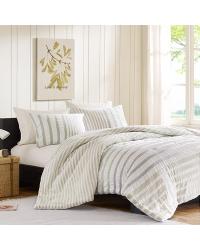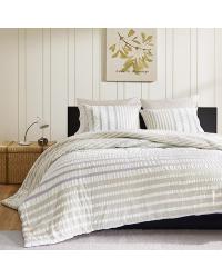 White seersucker with varied stripes of khaki, purple and green give this a clean look. The INK+IVY Sutton bedding set offers a unique comforter finishing technique that offers a clean, duvet-like finish with no bar tacks on the top of the comforter. Made from yard dyed, 100% cotton, this set includes a comforter/duvet cover and one sham.