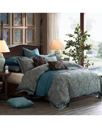 Gorgeous blues, mochas and espresso colors combine to create a lovely traditional paisley bedding set available in queen and king size. Sets include polyester/rayon jacquard comforter, pillow shams, euro shams and decorative accent pillows.