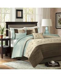 Machine washable faux silk creates a lovely floral comforter set for your bedroom. Red is combined with rich chocolate brown and ivory while the soft blue, taupe and brown make a beautiful bed.