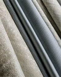 RM Coco Fabrics Silver Screen drapery and accent use upholstery fabrics feature fire retardant textured faux silks in a range of pattern choices.