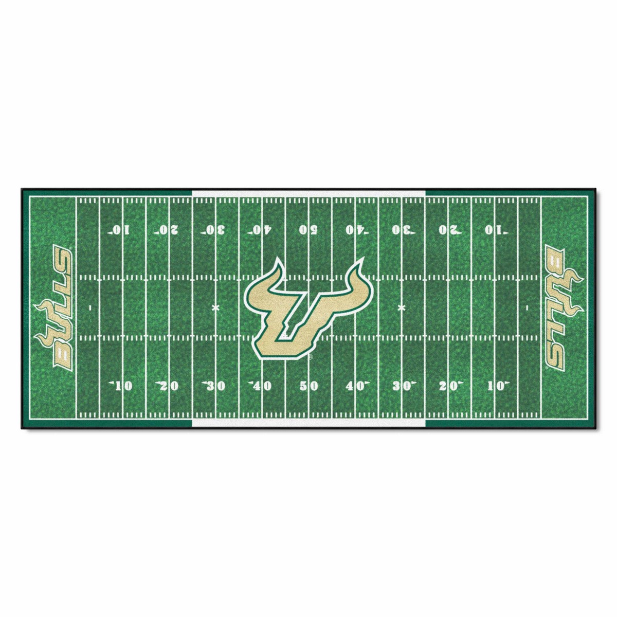 | South Florida Bulls Field Runner Mat - 30in. x 72in. 9 Ounce, 100 % Nylon Face Recycled vinyl backing for a durable and longer-lasting product Machine made and tufted in the USA Non-skid backing with serged borders for added durability Machine washable; vacuum regularly and spot clean for any easy and quick clean Officially licensed and chromojet-printed in true team colors for vibrant, lasting color University of South Florida in Florida |