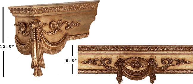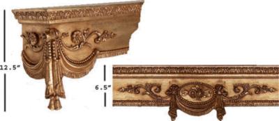 | Cornice Height: CTR.HT.=7" DROP HT.=12 1/2" The finished cornice board is made of 3/4" furniture grade wood as is the 3/4" wood dust cover. The elements that are on the cornices are made of a special Gesso wood fiber composition that is individually hand molded and hand applied to fit the scale of the cornice depending upon its width. Available finished only. Please email or call us for a quote. Prices start at $300 per foot and vary by style and color. Custom color base coats and accents are available by sending paint selector card for matching. Custom color up charge $20.00 per foot. Small cracks may exist from drying process. This happens occasionally and is normal and acceptable. The inside and top of the cornice is painted but not finished with antiquing. All cornices are custom made to your exact width and depth(return) requirements and are not subject to return or cancelable once order is placed. Molding adds 1 1/2" to the depth of cornice. Dust boards (top return board) are included. Add the clearance or return measurement to the width to determine the # of feet you are charged for. Round the number of inches up to the nearest foot. Include the inside width measurement and inside clearance in the comments of your order. Cornices over 10 ft. will have a 25% surcharge. Crating Charges: $25.00 per unit up to 12 feet - $35.00 per unit 12-18 feet Ships in 8-12 Weeks from time of order. Delivery dates cannot be guaranteed due to number of factors involved in custom fabrication. Samples A sample kit is available for a $100 refundable deposit when samples are returned within 30 days. Kit will include 3 color samples of your choice. More are available for an additional $20 per sample. The resin samples we supply in the sample kit are only facsimiles of the finished wood cornices and are for color clarification only. Priced per foot. Ask about custom height if needed. Please specify exact measurements. Minimum charge is 4 feet. Each uniquely hand crafted cornice is manufactured here in the United States to your specifications. |