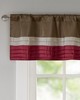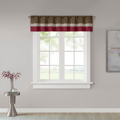 | Madison Park 50x18" 1 Window Valance: 50x18" 100% Polyester Polyoni.Lining: 100% Polyester Transitional Modern Style Includes 1 Piece(s) Machine wash cold, gentle cycle, and separately. Do not bleach. Tumble dry low, remove promptly. Do not iron. If there is no free movement in the washer or dryer, use large capacity commercial washer/dryer. Madison Park Amherst Polyoni Pintuck Window Valance is a simple way to add style to your room. This window valance features a modern striped design in rich hues of red, tan, and brown combined with pintuck detailing for beautiful texture and dimension. The added lining helps filter the perfect amount of light and creates fullness for better drapability. Finished with a rod pocket top, this window valance fits up to a 1.25" diameter rod. |