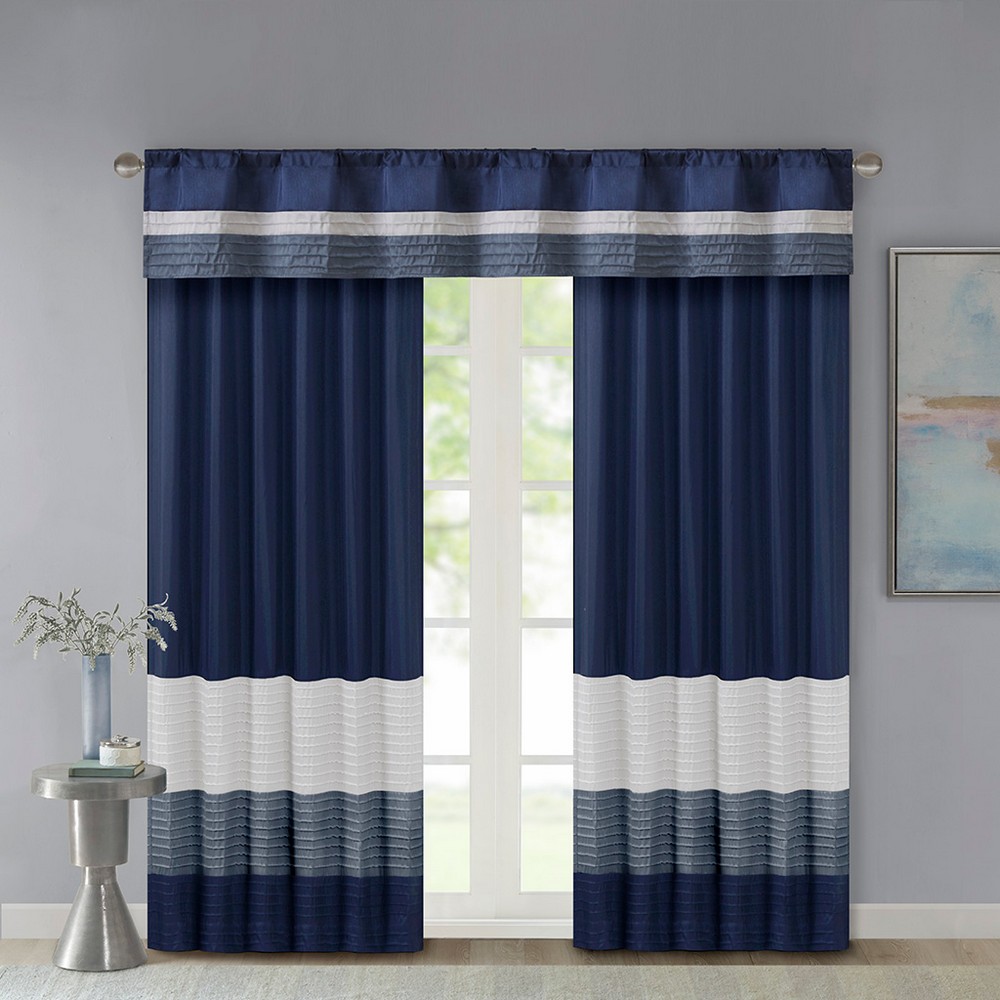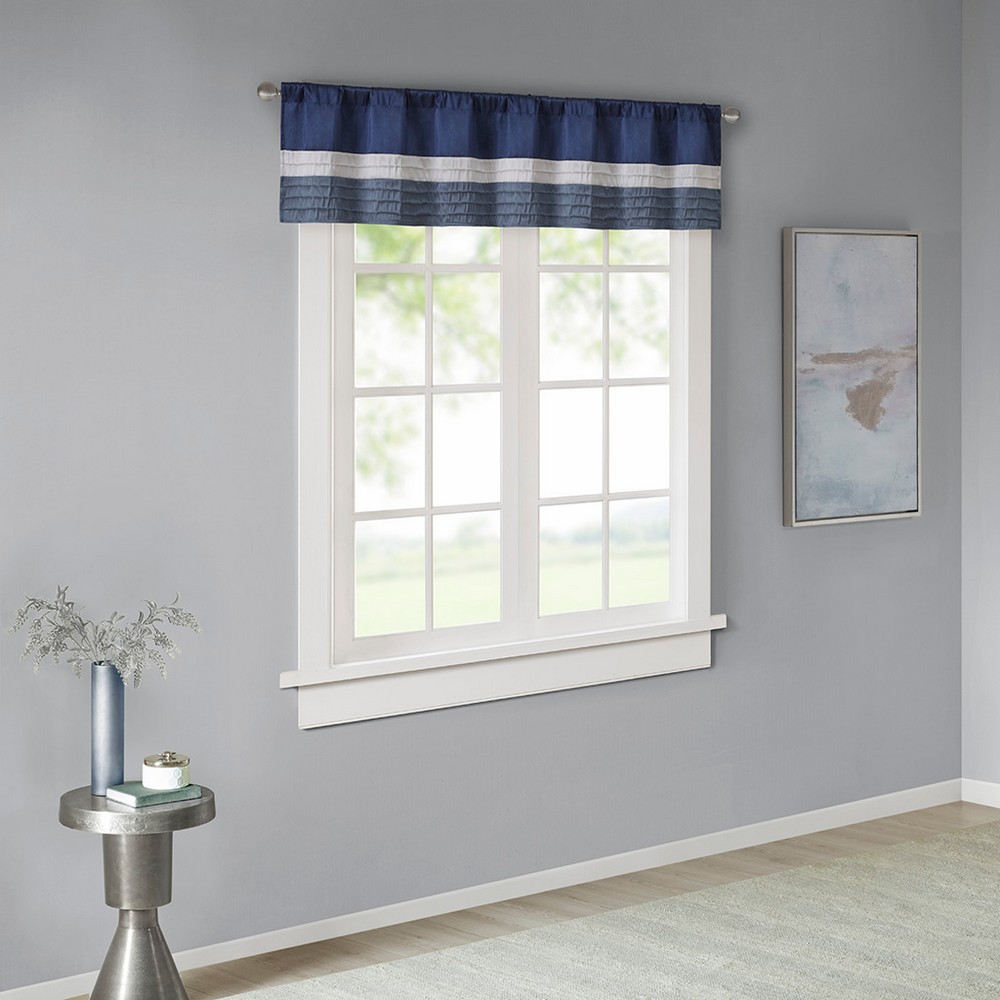| Madison Park 50x18" 1 Window Valance: 50x18" 100% Polyester Polyoni.Lining: 100% Polyester Transitional Modern Style Includes 1 Piece(s) Machine wash cold, gentle cycle, and separately. Do not bleach. Tumble dry low, remove promptly. Do not iron. If there is no free movement in the washer or dryer, use large capacity commercial washer/dryer. Madison Park Amherst Polyoni Pintuck Window Valance is a simple way to add style to your room. This window valance features a modern striped design in deep hues of navy, ivory, and slate combined with pintuck detailing for beautiful texture and dimension. The added lining helps filter the perfect amount of light and creates fullness for better drapability. Finished with a rod pocket top, this window valance fits up to a 1.25" diameter rod. |