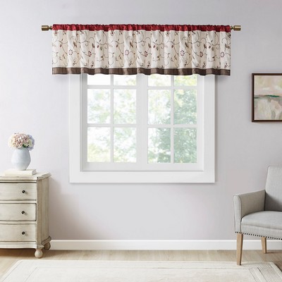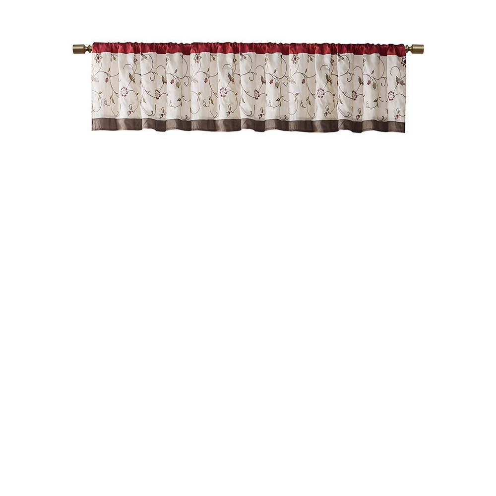 | Madison Park 50x18" 1 Window Valance: 50x18" 100% Polyester with embroidery detail and polyester lining, rod pocket Traditional Style Includes 1 Piece(s) MACHINE WASH COLD, GENTLY AND SEPERATELY, DO NOT BLEACH, TUMBLE DRY LOW, REMOVE PROMPTLY, DO NOT IRON. Add simple elegance to any room with the Madison Park Serene Embroidered Valance. This valance features delicate floral embroidery in rich red and natural hues, offering beautiful contrast for a sophisticated look. The pieced and pleated details provide extra dimension and charm to your home décor, while added lining helps filter the perfect amount of sunlight into your home. Simply hang on 3" rod pocket, fits up to a 1.25" diameter rod. |