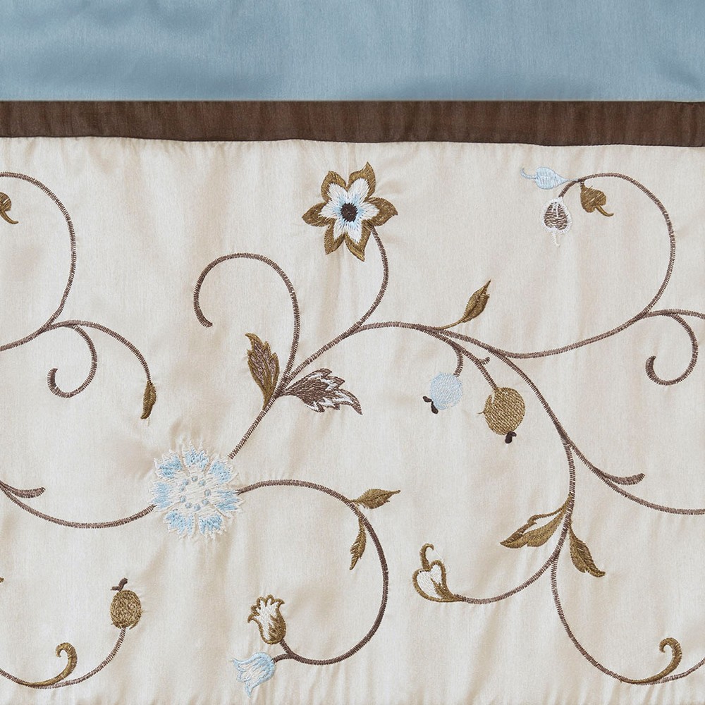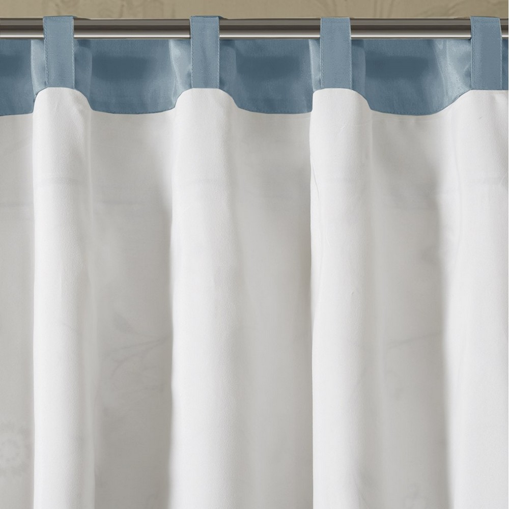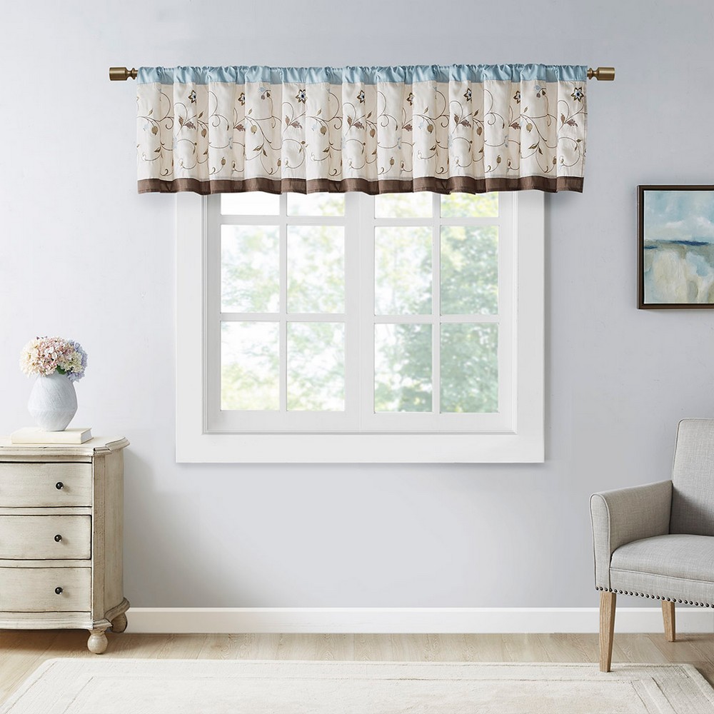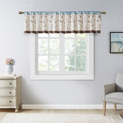 | Madison Park 50x18" 1 Window Valance: 50x18" 100% Polyester with embroidery detail and polyester lining, rod pocket Transitional Modern Style Includes 1 Piece(s) MACHINE WASH COLD, GENTLY AND SEPERATELY, DO NOT BLEACH, TUMBLE DRY LOW, REMOVE PROMPTLY, DO NOT IRON. Add simple elegance to any room with the Madison Park Serene Embroidered Valance. This valance features delicate floral embroidery in soft blue and natural hues, offering beautiful contrast for a sophisticated look. The pieced and pleated details provide extra dimension and charm to your home décor, while added lining helps filter the perfect amount of sunlight into your home. Simply hang on 3" rod pocket, fits up to a 1.25" diameter rod. |