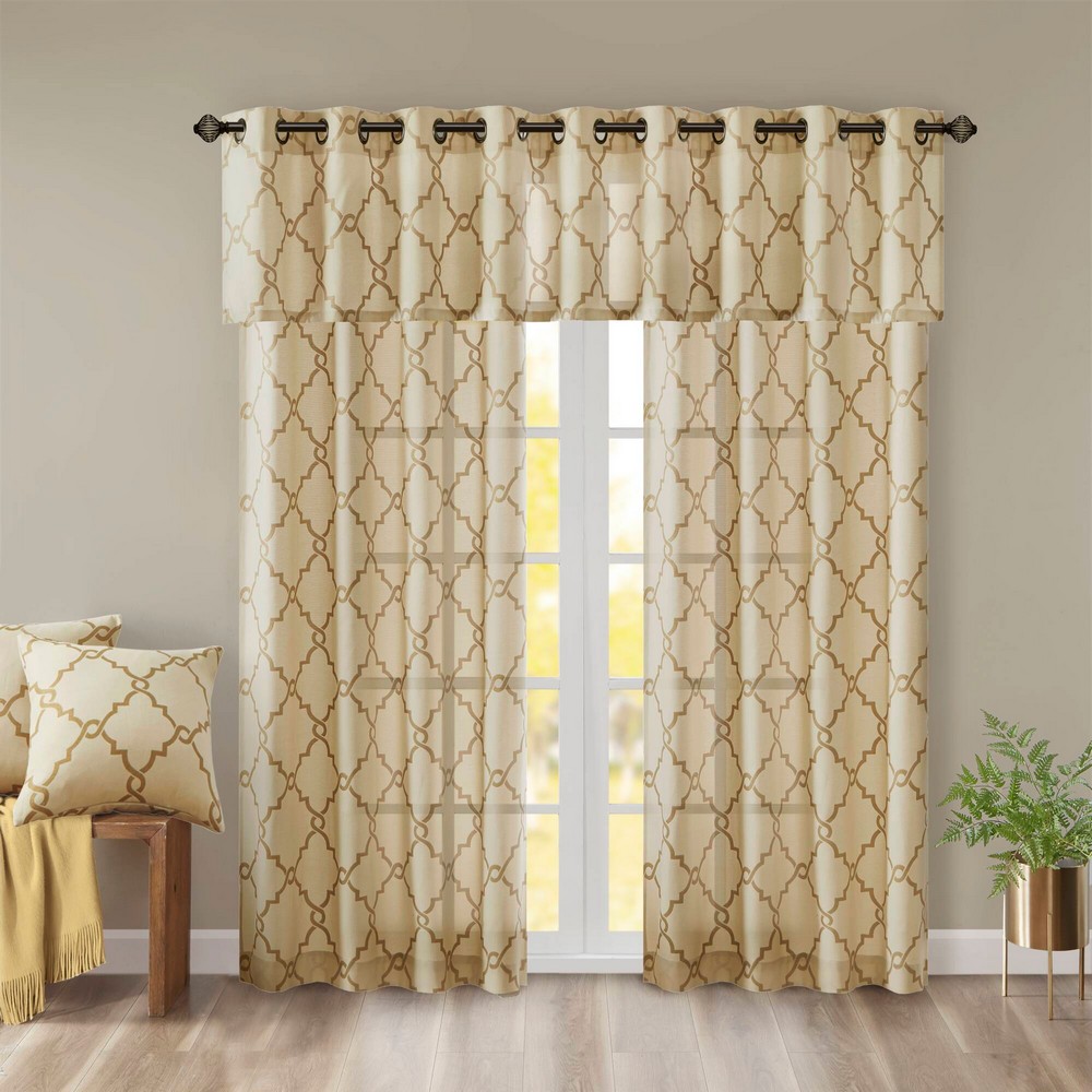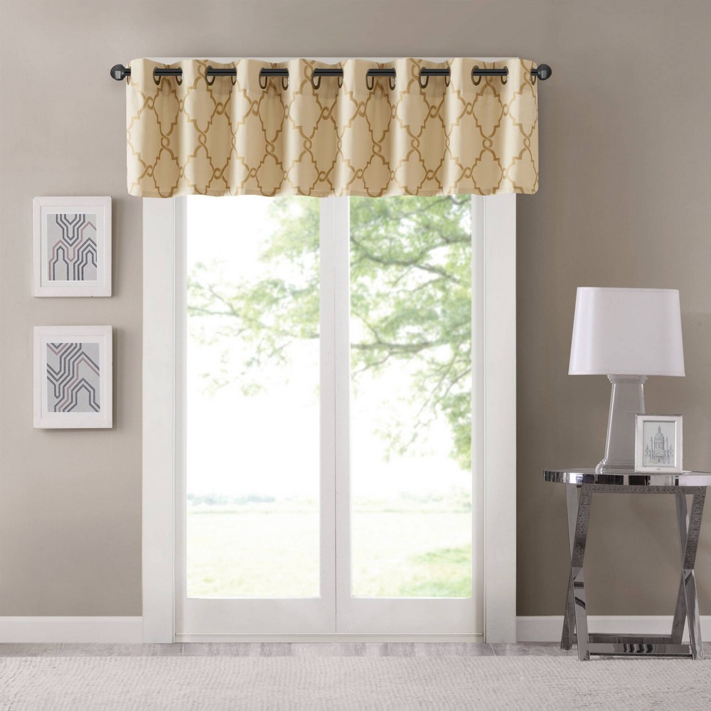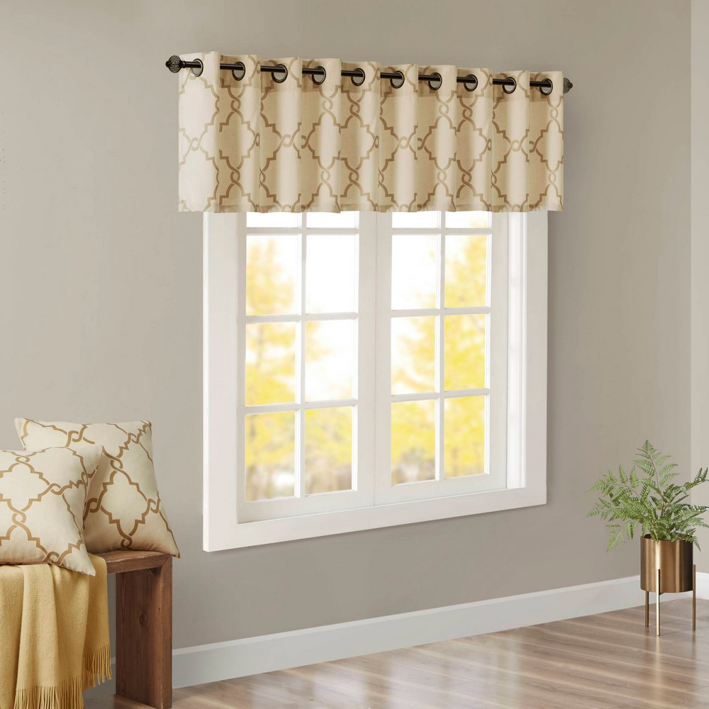| Madison Park 50x18" 1 Window Valance: 50x18" 68% poly 29% cotton 3% rayon; basket weave print, Grommet Top Modern/Contemporary Style Includes 1 Piece(s) Machine wash cold, gentle cycle, and separately. Do not bleach. Tumble dry low, remove promptly. Do not iron. If there is no free movement in the washer or dryer, use large capacity commercial washer/dryer. The Madison Park Saratoga Fret Print Window Valance is the perfect addition for a casual and stylish update to your home decor. This valance features a trendy metallic gold fretwork on a soft beige ground, creating a simple yet modern look. The cotton blend basket weave fabric softly filters the perfect amount of sunlight into your home, while providing texture for natural appeal. Gunmetal grommet top detail makes this panel easy to hang, open, and close throughout the day. Fits up to a 1.25" diameter rod. Pattern position may vary per valance due to random cutting of fabric. |