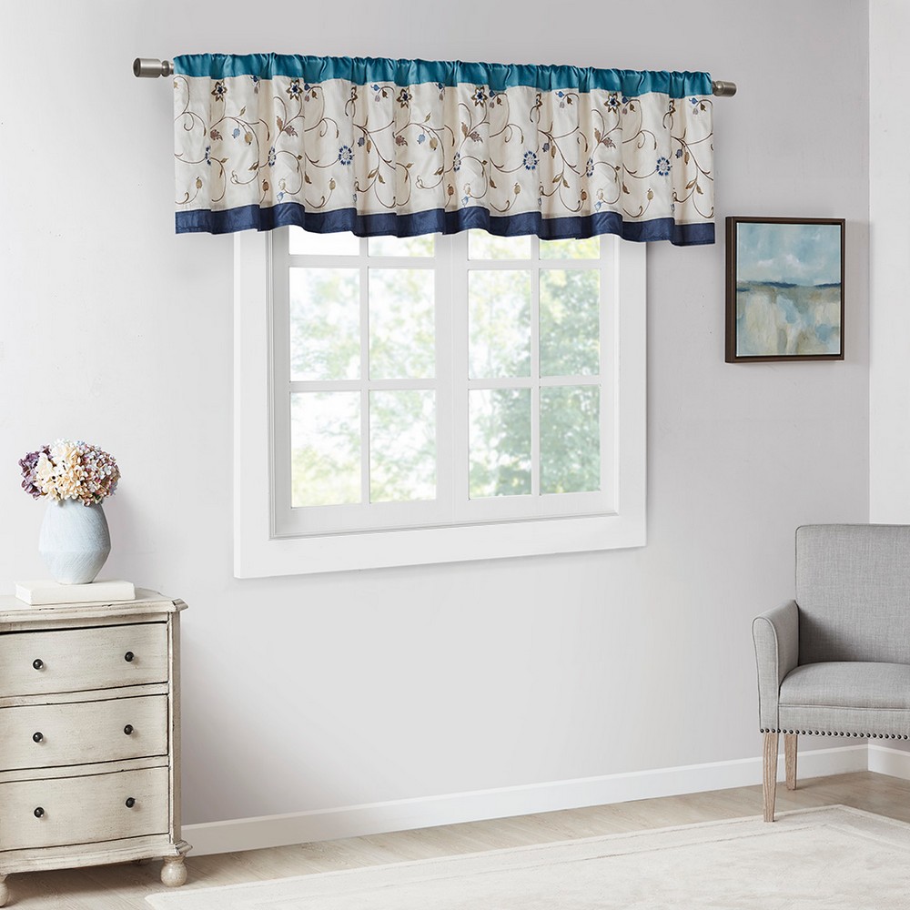 | Madison Park 50x18" 1 Valance: 50x18" 100% Polyester Traditional Style Includes 1 Piece(s) Machine Wash Cold Add simple elegance to any room with the Serene window valance. The deep navy color combined with soft ivory and chocolate brown creates the perfect classic look. The valance features delicate floral embroidery and lining to help filter light and provide some room darkening features. Valance is made with 3" rod pocket and fits up to 1.25" diameter rod. |