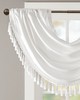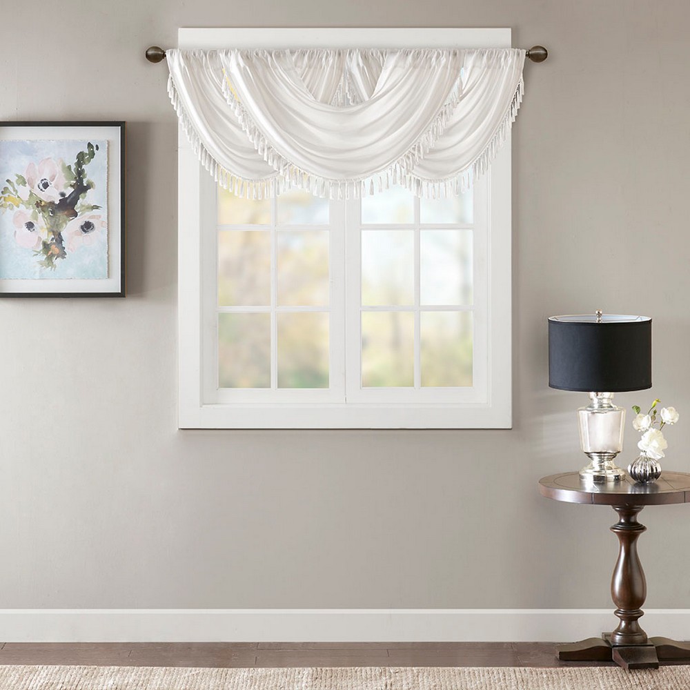 | Madison Park 38x46" 1 Window Valance: 38"W x 46"L Faux Silk; 100% Polyester Transitional Modern Style Includes 1 Piece(s) Machine Washable Bring style and sophistication to your windows, with our Elena Waterfall window valance. This classy white valance showcases rich center draping details and a beautiful tassel trim, combined with the faux silk fabric for a rich sheen and stylish update. Features added lining and a rod pocket top finish; fits up to 1.25" diameter rod. Part of our decorative valance collection, this valance is perfect as a stylish addition to any small window or even better as a layering piece to dress up any window panel. This window valance is also OEKO-TEX certified, meaning it does not contain any harmful substances or chemicals, ensuring quality comfort and wellness. Need to purchase 3 valances to create same look as image. |